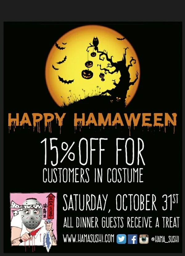 Happy Hamaween Party @ Hama Sushi Saturday, October 31, 2015 4:00 PM 11:00 PM 16:00 23:00 Hama Sushi 213 Windward Avenue Los Angeles, CA, 90291 United States (map) Google Calendar ICS