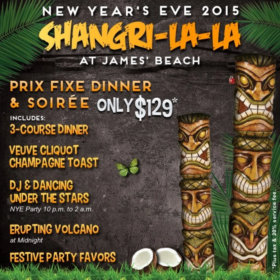 Day-of-Event Tickets to New Year's Eve Soirée 2015 at James' Beach now on sale. Get your tix online by 8:00 p.m. to avoid the line at the door and save $20! Buy here.
