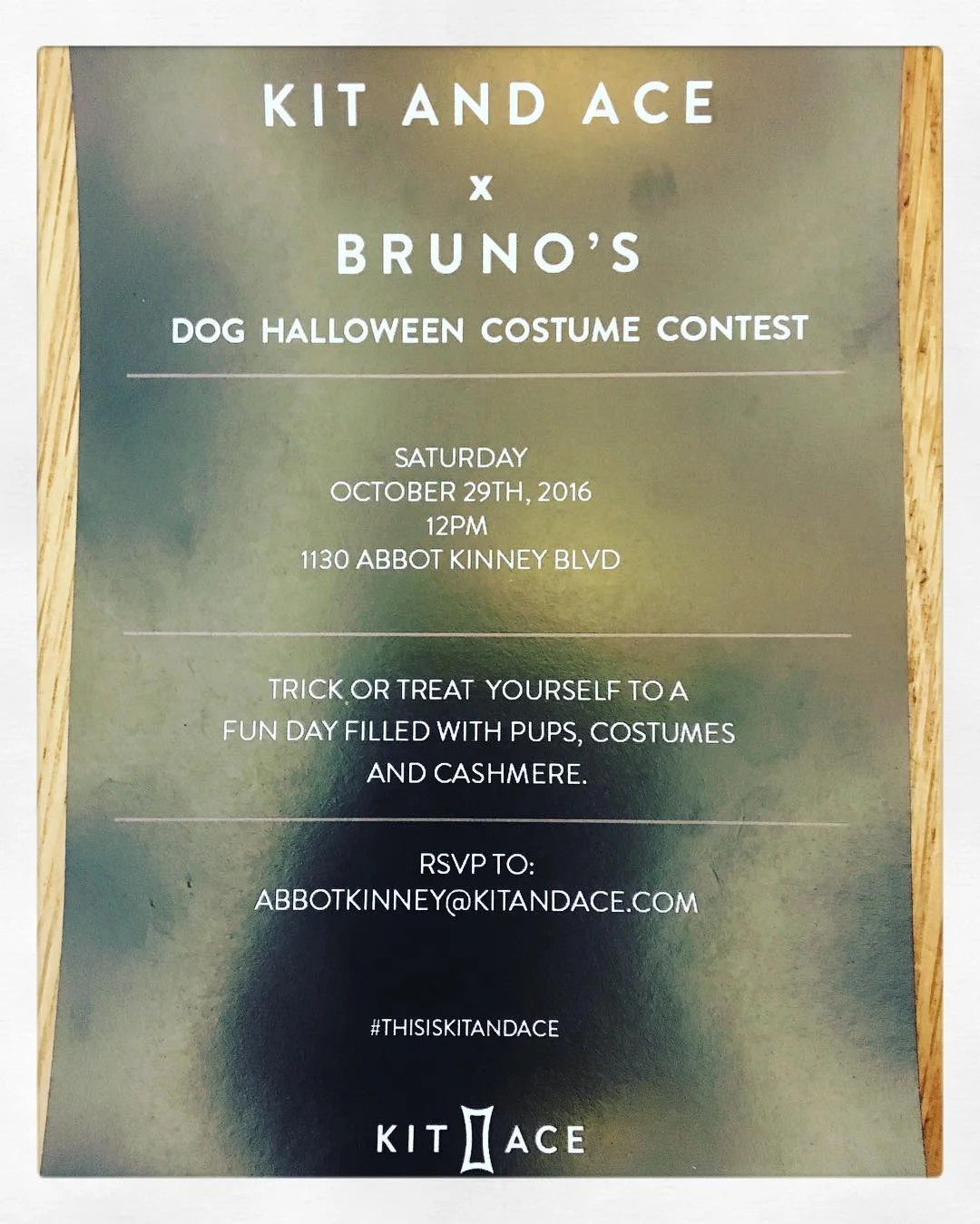 Kit + Ace and Bruno's Dog Halloween Costume Contest Saturday, October 29, 2016 12:00 PM 1:00 PM 12:00 13:00 Kit + Ace 1130 Abbot Kinney Boulevard Venice, CA, 90291 United States (map) Google Calendar ICS