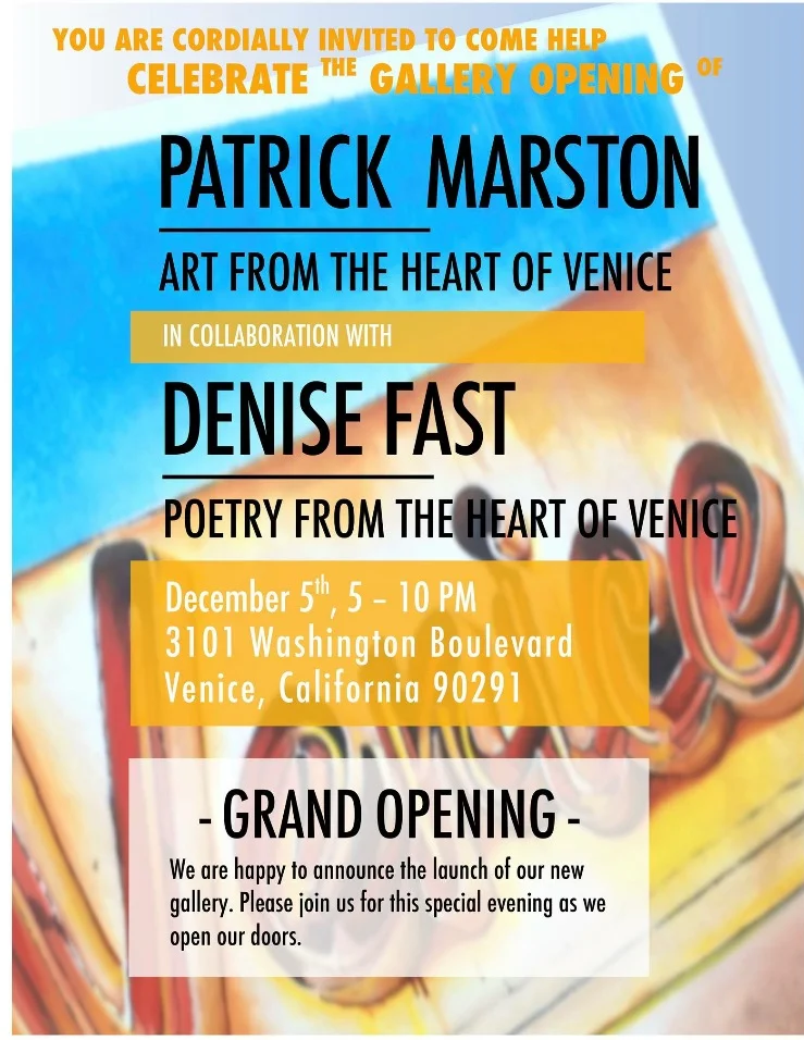 Patrick Marston Venice Gallery Opening Saturday, December 5, 2015 5:00 PM 10:00 PM 17:00 22:00 Patrick Marston Gallery 3101 Washington Blvd. Venice, CA 90291 (map) Google Calendar ICS