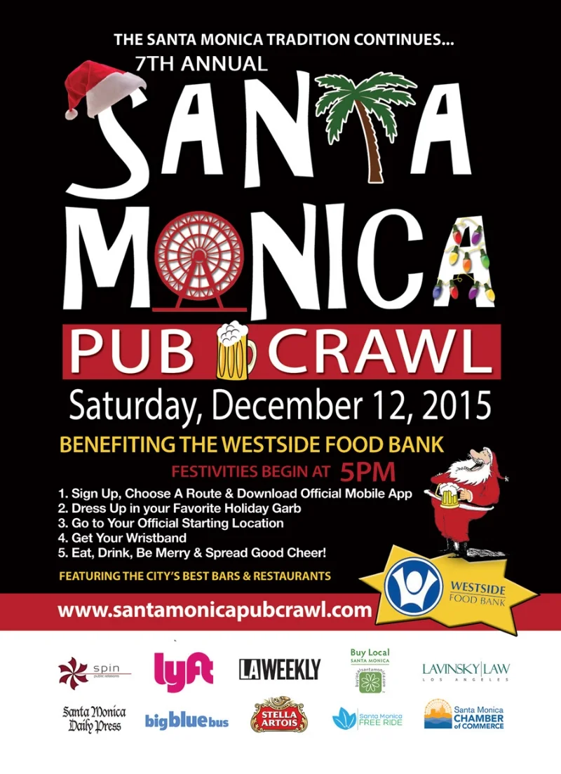 The 7th Annual SANTA Monica Pub Crawl returns Saturday, December 12, 2015 at 5 p.m. with more than 30 local bars and restaurants participating in the annual fundraiser benefitting the Westside Food Bank. Last year, nearly 6,000 crawlers donned antlers, Santa suits and elf attire for the event, and since its start, the SANTA Monica Pub Crawl has raised nearly $100,000 for its charity.
