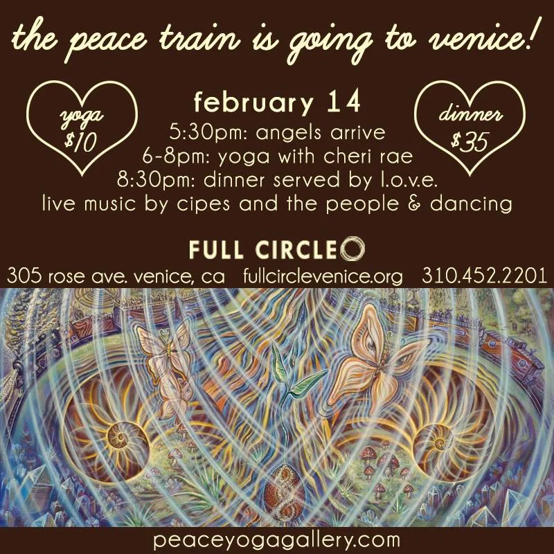 This Valentine's Day, the Peace Yoga Gallery is bringing the Peace Train to Full Circle Venice. The evening begins with two hours of bliss-filled yoga with Cheri Rae followed by an organic dinner served by L.O.V.E. and live music from Cipes & The People Dancing.