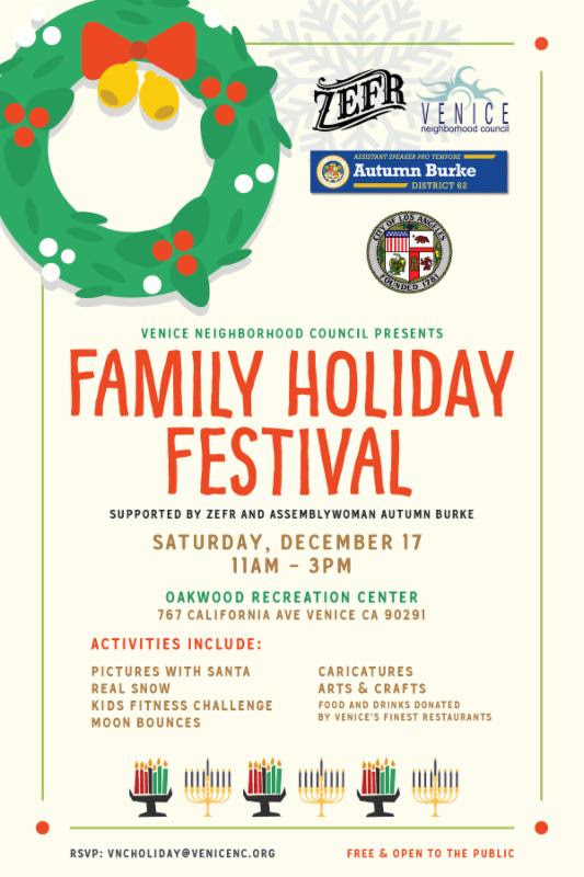 The sixth annual Family Holiday Festival hosted by the Venice Neighborhood Council will be held this Saturday, December 17, from 11am to 3pm at Oakwood Recreation Center. The free event is open to the community.