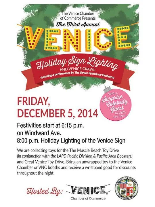 Venice Holiday Sign Lighting Friday, December 5, 2014 6:00 PM 7:00 PM 18:00 19:00 Venice Sign Windward Ave and Paific Los Angeles, CA, 90291 United States (map) Google Calendar ICS