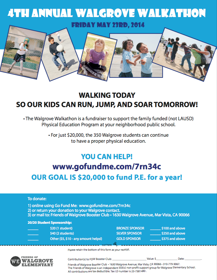 On Friday May 23, 2014 Friends of Walgrove will be sponsoring a Walk-A-Thon to raise funds to support the family funded (not LAUSD) Physical Education Program for Walgove Elementary. For less than $20,000 a year, the 350 students at Walgrove are able to enjoy a proper Physical Education which includes team sports, yoga and hands on training in living an active life.