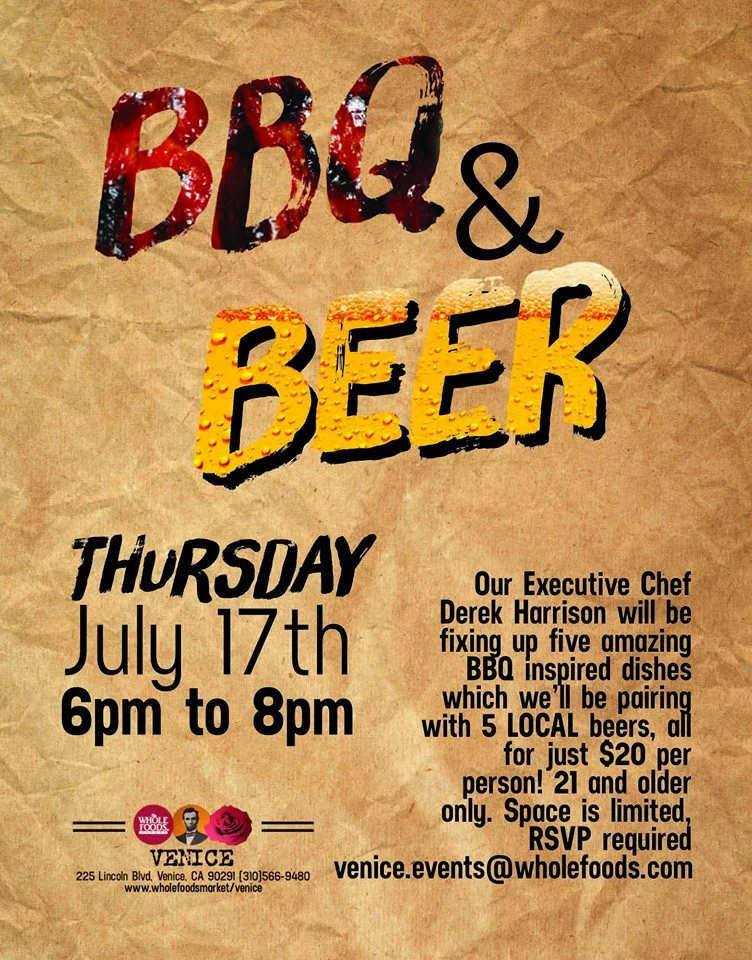 Whole Foods BBQ & Beer Thursday, July 17, 2014 6:00 PM 7:00 PM 18:00 19:00 Whole Foods Venice 225 Lincoln Blvd Los Angeles, CA, 90291 United States (map) Google Calendar ICS