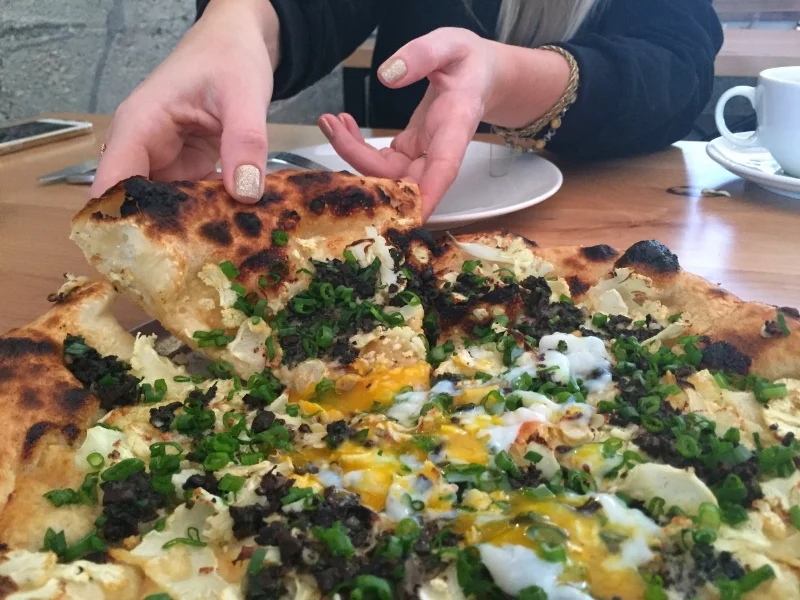 Baked eggs, breakfast burrito, potatoes and pizza with fried-egg toppers. (Photo by Tye Alfio @tyealfio.)