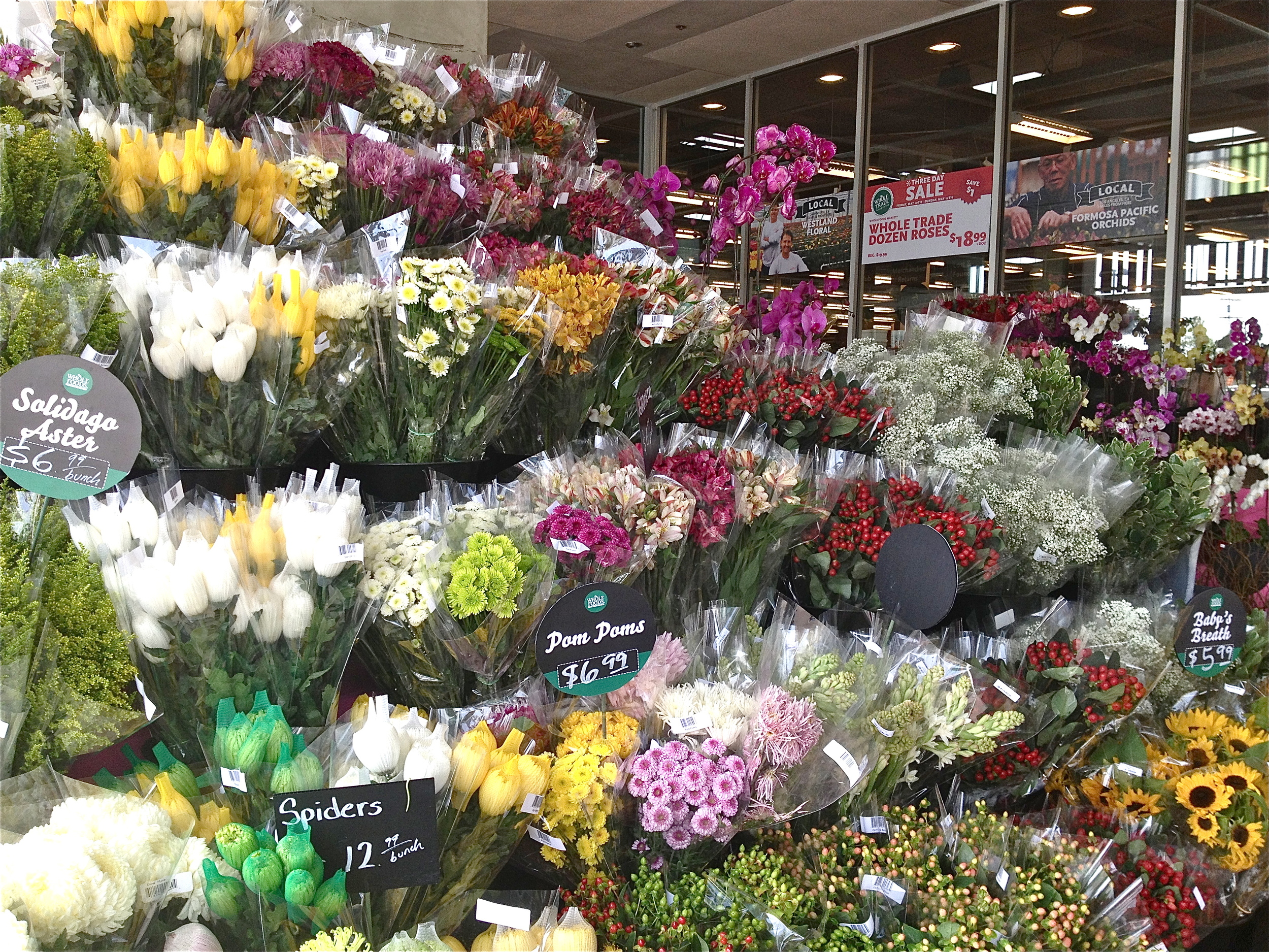 Whole Foods Venice flower mart is stocking up with dozens, and dozens, and dozens of fresh picks for Mother's Day this Sunday, the second-biggest flower-giving day of the year behind Valentine's Day. Specials include a dozen roses for $18.99 and long-stem strawberries for $3.