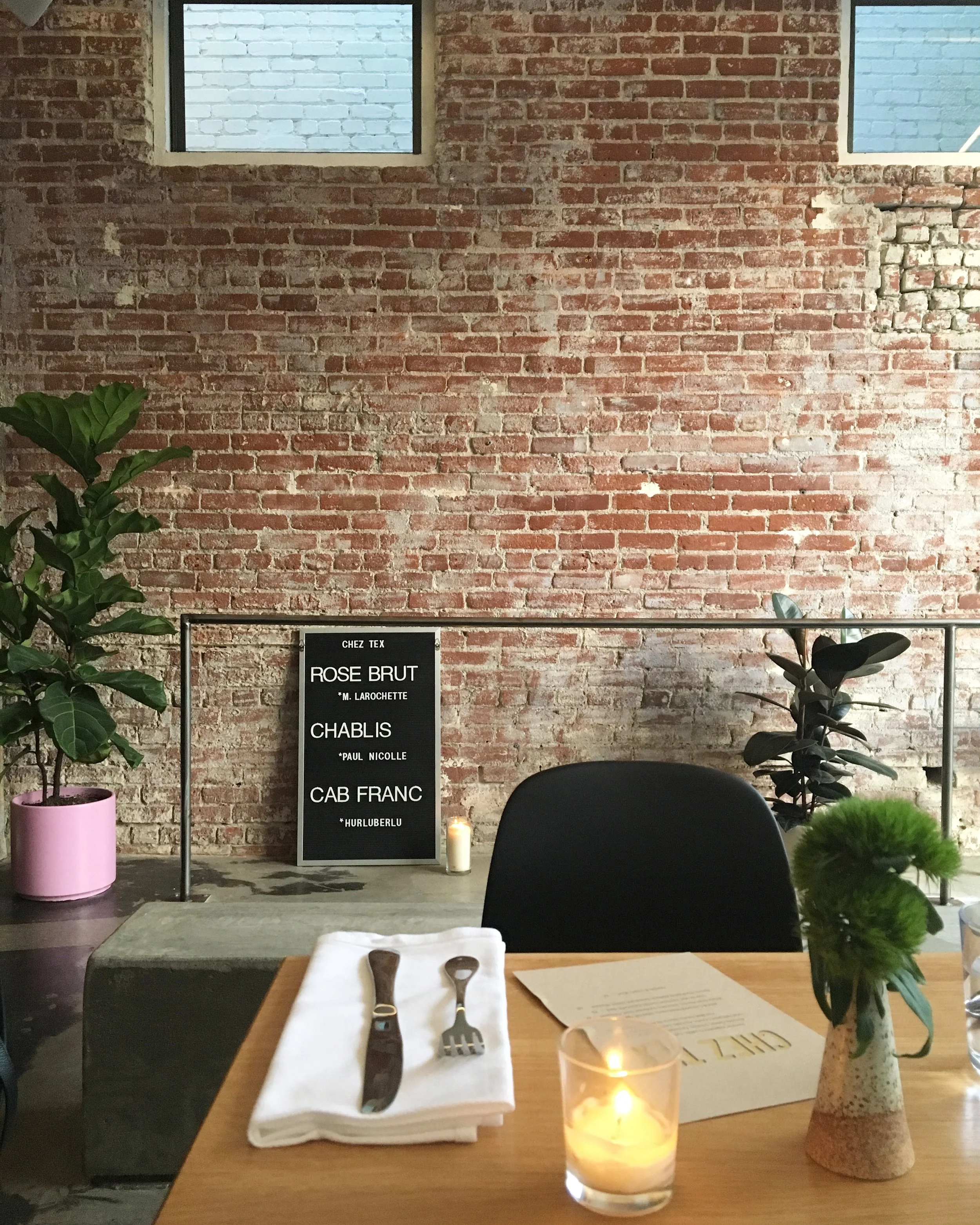 Harmonizing elements of casual comfort and modern elegance play into the decor as well. Located in the former antiques shop Obsolete, which was divided into three new spaces (two for relocated Abbot Kinney boutiques Mona Moore and Pamela Barish), Chez Tex features a sleek concrete bar set against the rustic, exposed brick wall of the century-old building. Floor-to-ceiling glass doors open out to a view of the Renaissance building's columns and arches and a street sign that marks the entry point from Santa Monica into Venice. The tables are appointed with bud vases and plates from L.A.-based Humble Ceramics, and mid-century details like fiddle leaf trees in Gainey pots and Normann Copenhagen chairs (sourced at Abbot Kinney's A+R Design) do their part to save space and modernize the look.
