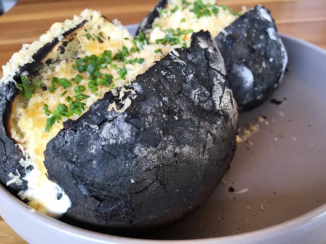 A side of potatoes baked in the coals and topped with creme fraiche, aged Gouda, and chives. Photo by Charcoal Venice
