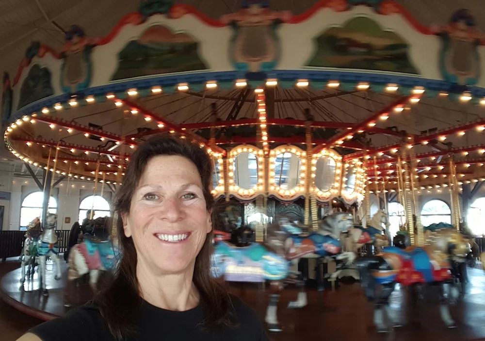 Robin Murez at the Looff Hippodrome Carousel in Santa Monica. After several years of placing public art throughout Venice, she's determined to hand-carve figures for a bicycle-powered carousel to be placed at Centennial Park, between North and South Venice Boulevards, by next year. (Photo by Robin Murez)
