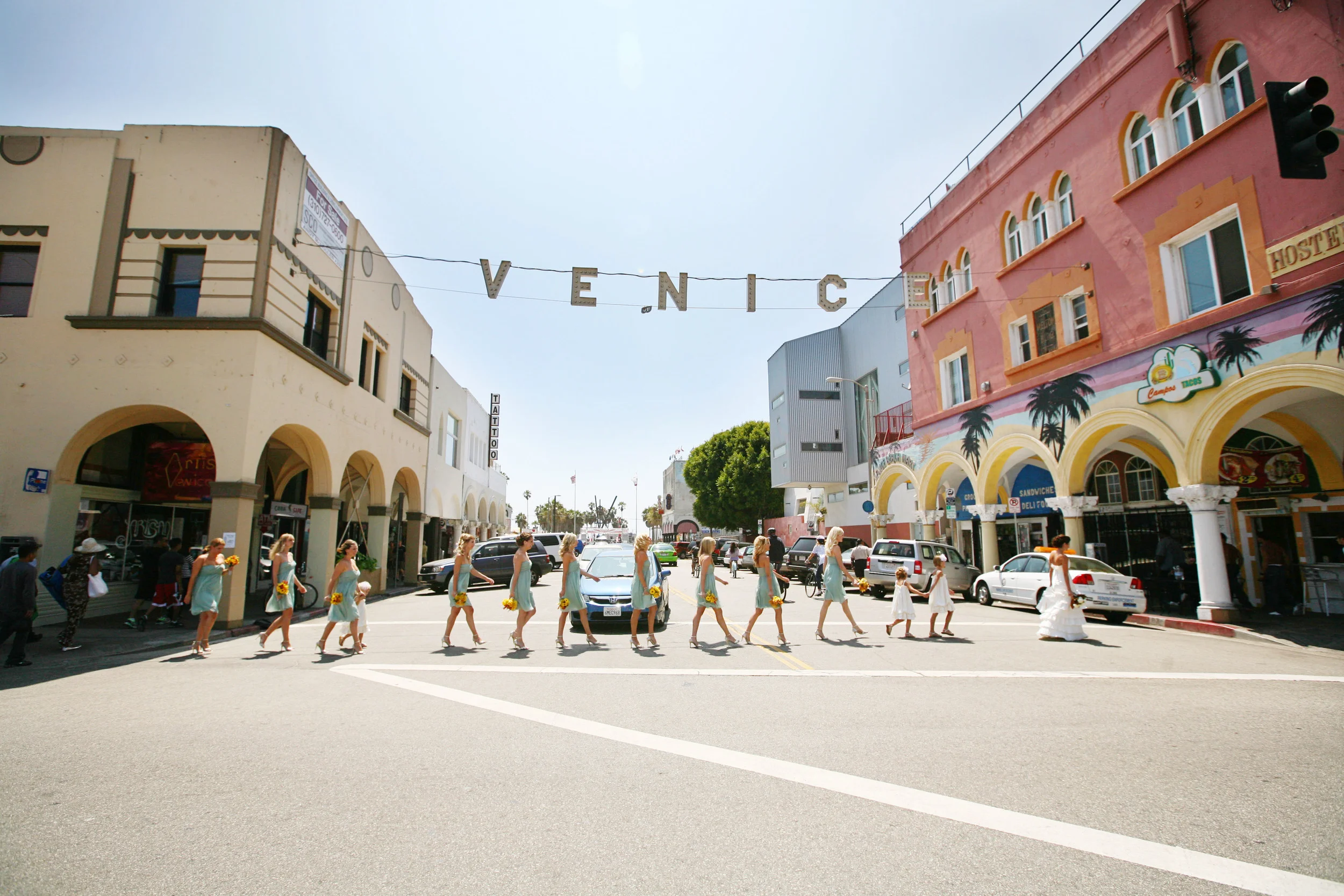 The girls all gathered at the Erwin to get ready in the morning. The hotel overlooks the Boardwalk and is just off Windward Ave. so we were able to walk over and take our "Abbey Road" shot under the Venice sign before we left for the Smog Shoppe, where the ceremony and reception were held. With a wedding party as big as ours, a party bus was in order, so we reached out to Alice The Wonder Bus, which is painted in artwork by the local muralist Chase. They were more than happy to give us a lift and even surprised us with a cooler of chilled Champagne.